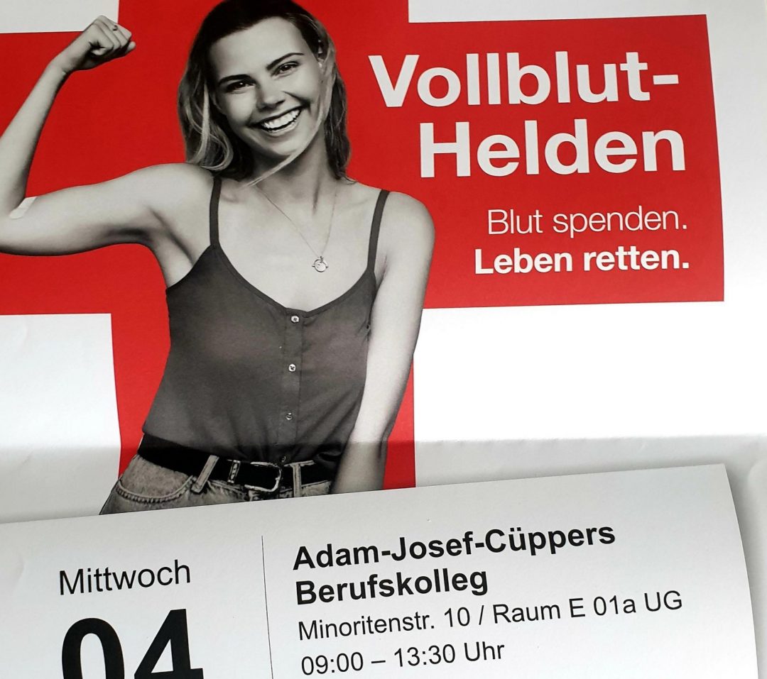Vollbluthelden – so nennt der Blutspendedienst West des Deutschen Roten Kreuzes seine Spender. Am 4. März 2026 ist es wieder so weit. Zwischen 9 und 13.30 h gibt es im Raum E01a (Untergeschoss) des Adam-Josef-Cüppers-Berufskollegs die nächste Gelegenheit Held zu werden und Leben zu retten. Potentielle Spender müssen gesund sein, volljährig und sich mit einem Dokument ausweisen. Gleichzeitig besteht die Möglichkeit, sich typisieren und in die Stammzellenspenderdatei eintragen zu lassen.