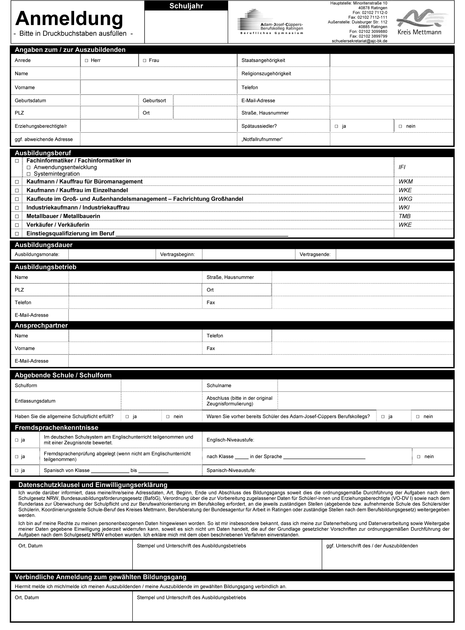 Hier findest du alle organisatorischen Informationen rund um das Adam-Josef-Cüppers Berufskolleg. Von wichtigen Terminen bis hin zu Regelungen für den Schulalltag – wir halten dich auf dem Laufenden, damit du bestens vorbereitet bist.